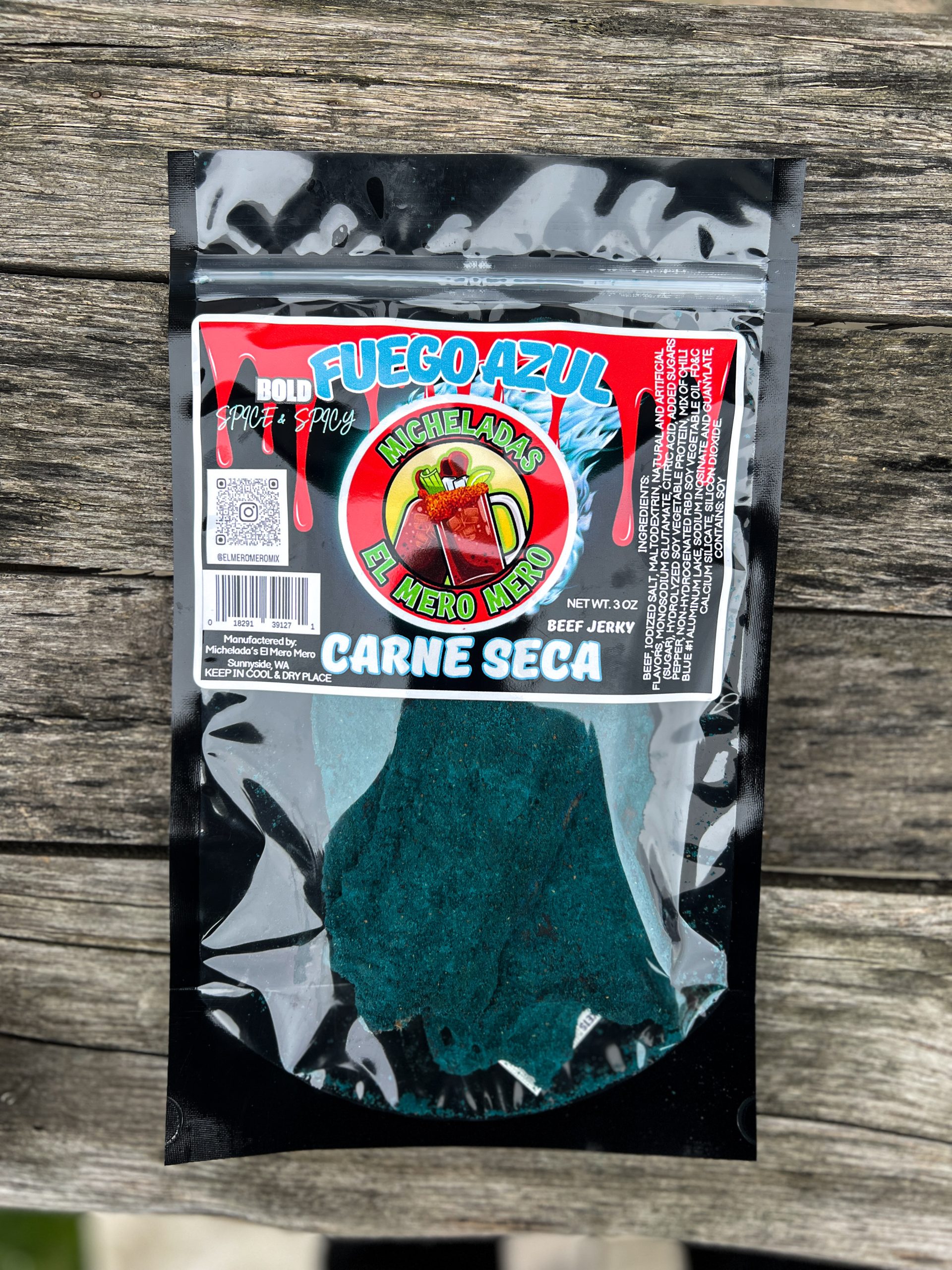 - Turn up the heat with Micheladas El Mero Mero’s Fuego Azul Carne Seca – our boldest and spicy beef jerky yet! Made with premium cuts of beef and coated in signature blur chile powder blend, this 3oz bag of fiery goodness is packed with flavor, heat, and attitude. Whether you are snacking on the go or pairing it with your favorite Michelada, Fuego delivers a mouthwatering punch that keeps you coming back for more.